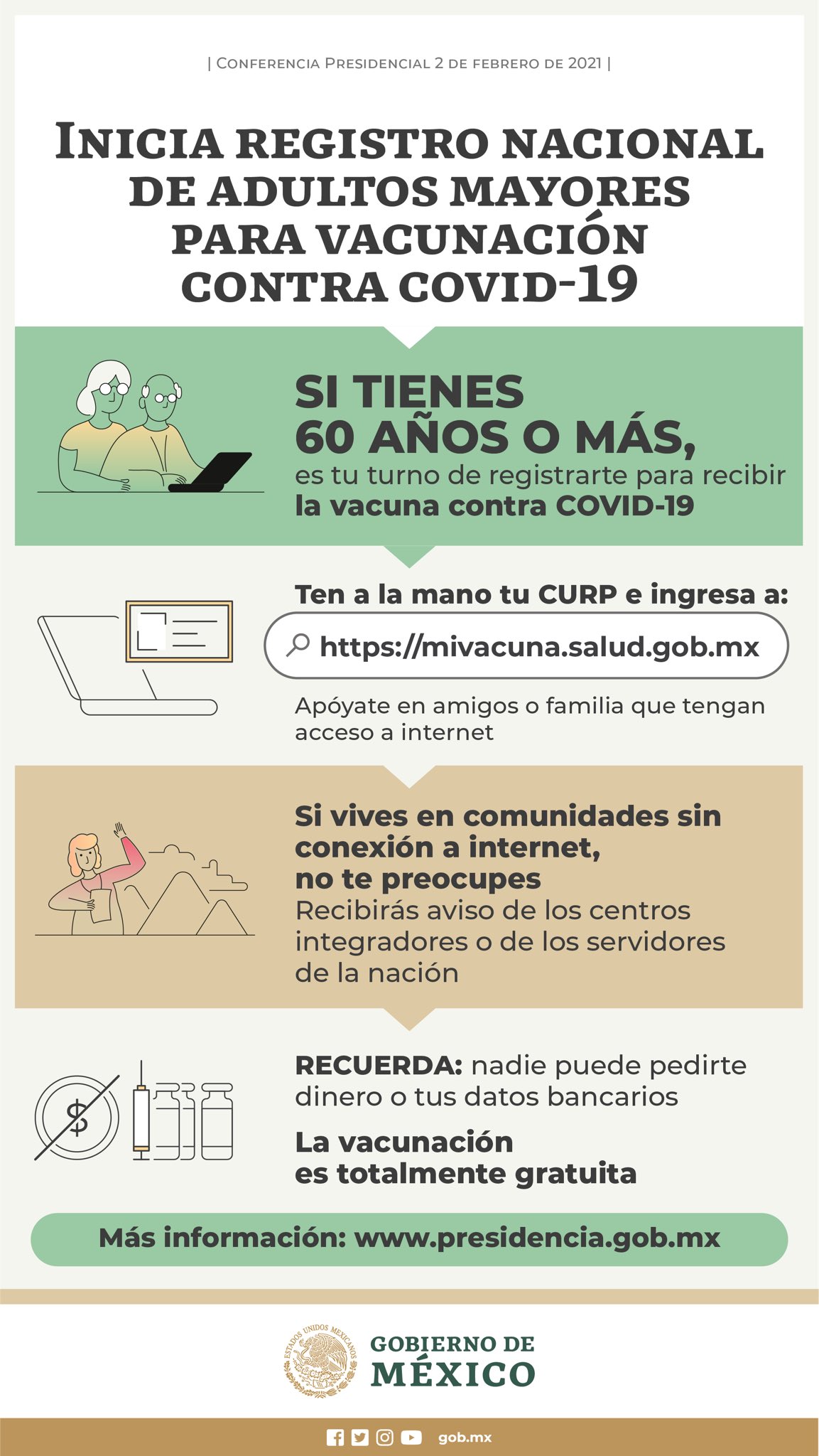 Cómo registrarme en mi vacuna.salud.gob.mx. Todas las vacunas aprobadas son sometidas a pruebas rigurosas a lo largo de las diferentes fases de los ensayos clínicos, y siguen siendo evaluadas regularmente una vez comercializadas. Si tienes más de 60 años ya puedes inscribirte para recibir la vacuna contra #covid19. Aquellas personas que hayan extraviado, olvidado, o que no la tengan a la mano su clave única de registro de población (curp) podrán consultarla a través del sitio www.gob.mx/curp desde cualquier dispositivo. Guía para registrarse en mivacuna.salud si eres adulto mayor.